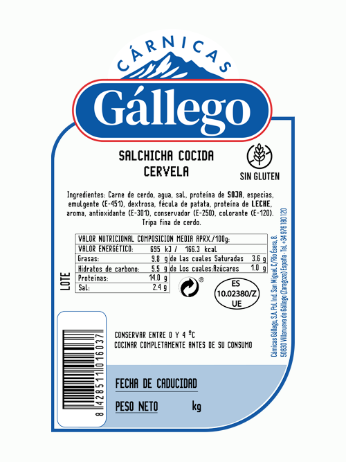 La salchicha cervela originalmente es un embutido alemán-suizo, es un elaborado cárnico muy consumido y apreciado por los más peques de la casa. Se prepara con carne picada de cerdo cocida, así como de varias especias y aromas. De sabor suave y textura jugosa, embutidas en tripa natural de cerdo y envasadas en paquetes de dos unidades.